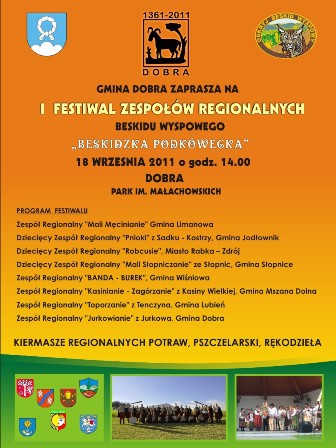 Gmina Dobra zaprasza na I Festiwal Zespołów Regionalnych Beskidu Wyspowego "Beskidzka podkówecka", który odbędzie się w ramach Jubileuszu 650-lecia wsi Dobra.Festiwal odbędzie się w dniu 18 września 2011 r. w Parku im. Małachowskich w Dobrej. Rozpoczęcie o godz. 14:00.Podczas Festiwalu wystąpią następujące zespoły:- Dziecięcy Zesp...